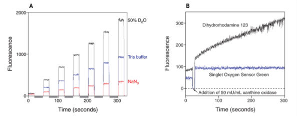 如圖、Singlet Oxygen Sensor Green (SOSG)的熒光反應和對單線態(tài)氧(1O2)的特異性。A)用熒光光度計(Ex/Em= 488/525nm)測定溶液內(nèi)的熒光,溶液內(nèi)含SOSG(1 μM )和亞甲基藍(10 μM)溶于100mM pH 7.5 Tris Buffer; 單線態(tài)氧清除劑疊氮鈉(NaN3,1 mM);或50% D2O(重水,能夠延長1O2的壽命)。每20s完成一次熒光測定,每次測定間隔30s(如灰條標示)。在這30s的間隔中,樣本暴露于激光輻射(630–680 nm,<5 mW),導致亞甲基藍光敏生成1O2。B)用熒光光度計(Ex/Em=488/525nm)測定溶液內(nèi)的熒光,溶液為50mM pH 7 Tris buffer,1mM 黃嘌呤,SOSG(1 μM ),或含SOSG(1 μM ),或含二氫羅丹明123。約20s之后,加入50 mU/mL黃嘌呤氧化酶(XO)。XO催化黃嘌呤的氧化,產(chǎn)生尿酸和超氧化物。超氧化物瞬間被H2O2降解。