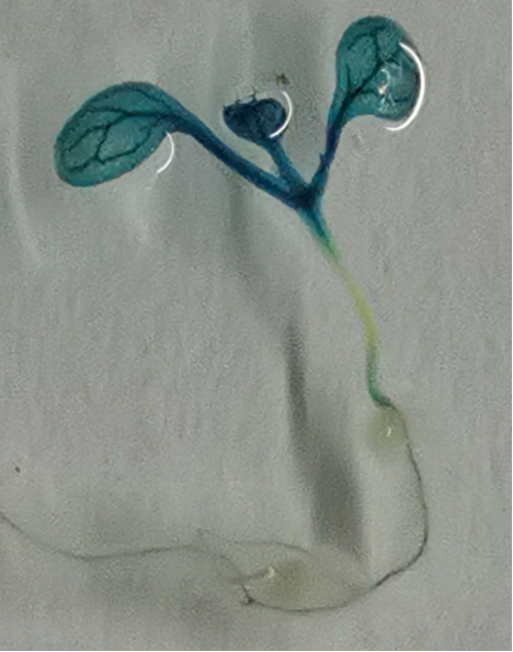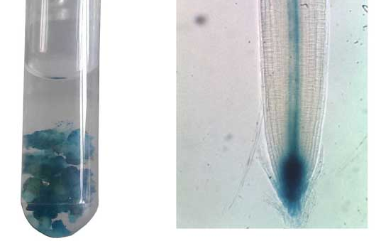 2.染色:加入適量配制好的GUS染色工作液至完全覆蓋材料;錫箔紙包好后搖床搖動(dòng)10分鐘或更長(zhǎng)時(shí)間至材料出現(xiàn)藍(lán)色。注意要做陰性和陽性對(duì)照實(shí)驗(yàn)。