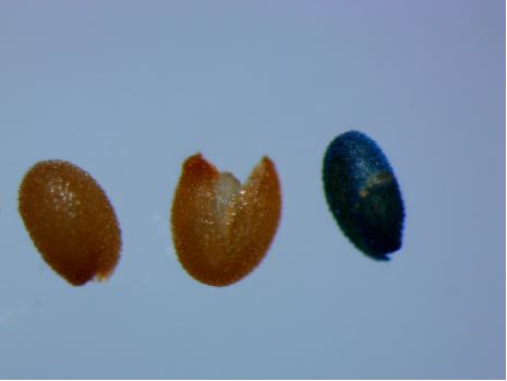 4.觀察:一般染色后,GUS染色陽性的藍(lán)色斑點(diǎn)肉眼就能看到。但是有些材料可能藍(lán)色斑點(diǎn)很細(xì)微,要在顯微鏡下才能看到。