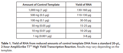 AmpliScribe Kits produce exceptionally high yields of either long or short transcripts. The standard AmpliScribe reaction can be scaled up to produce milligram amounts of RNA. In addition, an AmpliScribe reaction can be readily modified to prepare fluorescent-1, biotinylated-2, or digoxigenin-3labeled RNA. Produce high yields of high quality RNA quickly and easily.