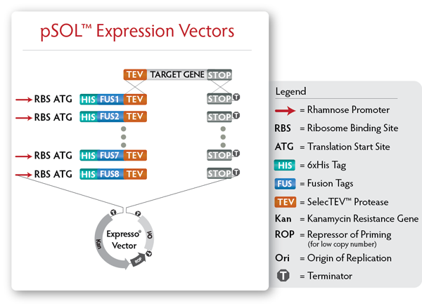Figure 1. Each pSOL vector contains everything you need to seamlessly clone in your target gene without any additional amino acids added. Fusion tags are cleavable via a TEV protease site.