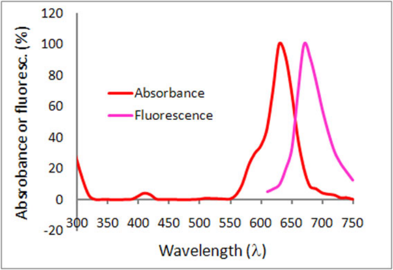 Absorbance and fluorescence scan of Acti-stain? 670. Labeled phalloidin was diluted into methanol and its absorbance and excitation spectra were scanned between 300-750 and 600-750 nm, respectively. Absorbance peaks at 625 nm and fluorescence at 675 nm.