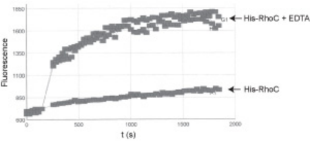 The biological activity of His-RhoC is determined from its ability to catalyze the exchange of GDP for GTP. EDTA is used to sequester magensium ions from the His-RhoC protein, thereby stimulating nucleotide exchange activity. The RhoGEF exchange assay biochem kit (Cat. # BK100) is used to monitor the exchange ability of His-RhoC.