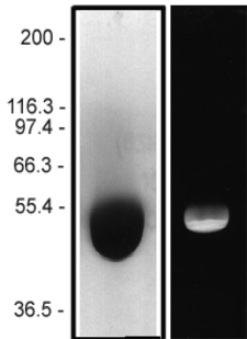 Figure 1: AMCA tubulin protein purity determination. A 50 μg sample of unlabeled tubulin protein was separated by electrophoresis in a 4-20% SDS-PAGE system and stained with Coomassie Blue (A). Protein quantitation was performed using the Precision Red Protein Assay Reagent (Cat. # ADV02). 20 μg of the same protein sample was run in a 4-20% SDS-PAGE system and photographed directly under UV illumination (B).
