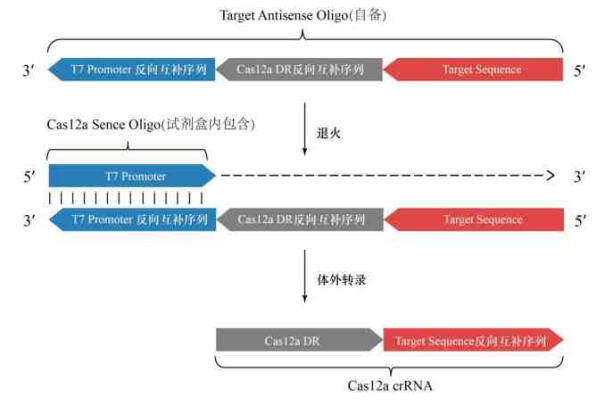Cas12a crRNA 轉(zhuǎn)錄原理示意圖如圖 1 所示,試劑盒中已提供 Cas12a Sense Oligo,只需根據(jù)待測(cè)目標(biāo)序列設(shè)計(jì) Target Antisense Oligo。