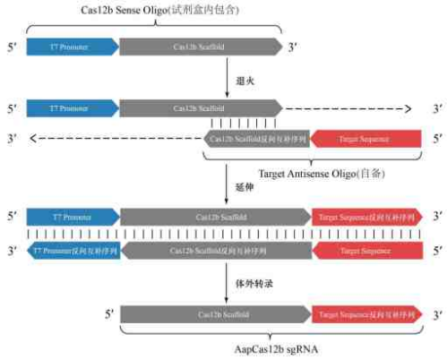 Cas12b sgRNA 轉錄原理示意圖如圖 1 所示,試劑盒中已提供 Cas12b Sense Oligo,只需根據(jù)待測目標序列設計 Target Antisense Oligo。