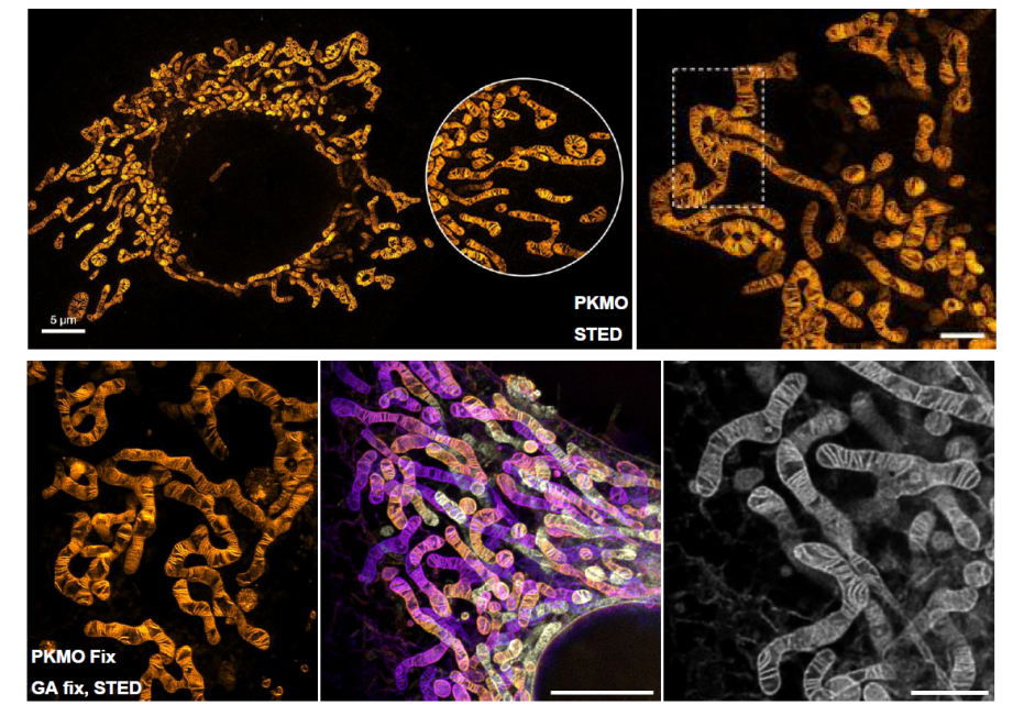PKMITO??系列的Red、Orange?及Deep Red 具有非常低的化學毒性、光學毒性和優(yōu)秀的線粒體定位能力,適用于活細胞線粒體成像。除此之外,此系列產(chǎn)品也已經(jīng)在斑馬魚等小動物實驗中用于線粒體成像。PKMO FX 在細胞經(jīng)醛類固定液固定后依然有高的線粒體熒光保留,適用于固定細胞線粒體成像。綜合這些優(yōu)異的性能,PKMITO??系列產(chǎn)品非常適合用于多種場景下的線粒體成像,尤其在SIM?和STED 等超分辨成像和細胞分選等領域。