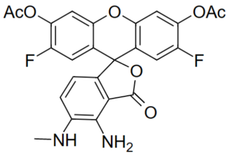 DAF-FM DA即4-Amino-5-Methylamino-2',7'-Difluorofluorescein Diacetate,也稱DAF-FM Diacetate,是最新一代用于一氧化氮(nitric oxide, NO)定量檢測的探針,其檢測原理為:DAF-FM DA可以穿過活細胞膜(cell-permeable),進入細胞后可以被胞漿內的酯酶催化形成不能穿過細胞膜的DAF-FM。DAF-FM本身僅有很弱的熒光,光量子約0.005,但在與NO反應后生成熒光素-苯駢三氮唑(benzotriazole),發(fā)強烈綠色熒光,光量子約0.81。Ex~495 nm,Em~515 nm。任何可以檢測熒光素(fluorescein)的儀器,包括熒光顯微鏡、激光共聚焦顯微鏡、流式細胞儀、熒光分光光度計或熒光酶標儀都可以用于該熒光探針的檢測。
