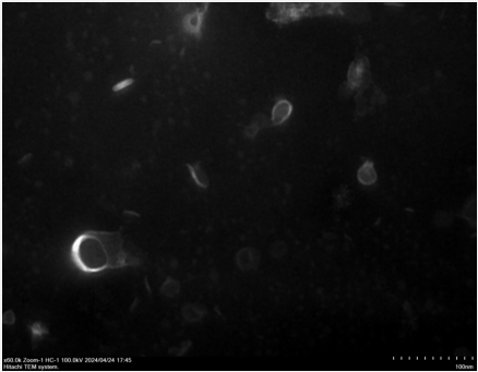 重懸外泌體至50-100 μL 2% PFA中,將5 μL混合懸液加到Formvar-carbon載樣銅網(wǎng)上;也可將5-10 μL混合懸液滴加到封口膜上,將銅網(wǎng)Formvar膜面朝下放在懸液上。每個(gè)樣品準(zhǔn)備2-3個(gè)銅網(wǎng);將100 μL PBS加到封口膜上。用鑷子將銅網(wǎng) (Formvar膜面朝下) 放在PBS液滴上清洗(在所有步驟中,都應(yīng)保持Formvar膜面濕潤(rùn),而另一面干燥);將銅網(wǎng)放在50 μL 1%戊二醛液滴上5 min;將銅網(wǎng)放在100 μL ddH2O洗滌8次,每次洗2 min;將銅網(wǎng)放在50 μL草酸雙氧鈾液滴上(pH 7.0),5 min;將銅網(wǎng)放在50甲基纖維素液滴上10 min,冰上操作;銅網(wǎng)放到樣品臺(tái)頂端的不銹鋼環(huán)上,用濾紙吸去多余液體;空氣中干燥5-10 min;將銅網(wǎng)放在樣品盒內(nèi),80 kV下拍攝電鏡照片。