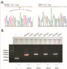 文章中,作者比較了在PCR,測(cè)序以及ARSP在非小細(xì)胞肺癌中EGFR突變檢測(cè)應(yīng)用,發(fā)現(xiàn)在非小細(xì)胞肺癌細(xì)胞系中,5分鐘便能檢測(cè)到EGFR 19Del(2)缺失突變,10分鐘檢測(cè)EGFRL SNP 突變,實(shí)現(xiàn)肉眼快速判斷(圖1),并在組織樣本中同樣得到驗(yàn)證(圖2)。