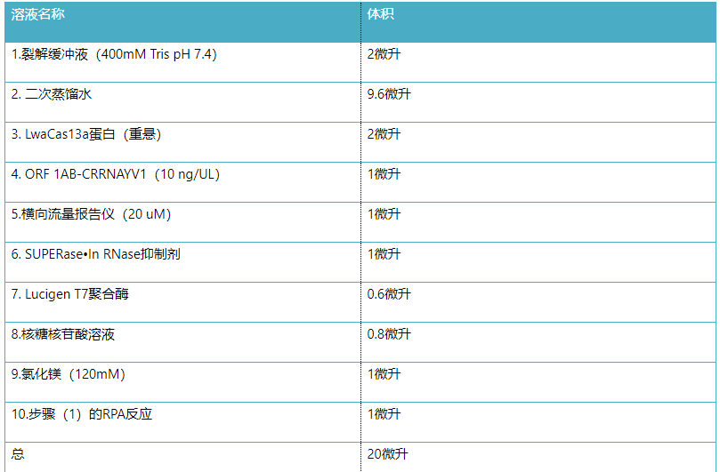 3、對于每個(gè)Orf1ab基因RPA反應(yīng),如下設(shè)置Cas13檢測反應(yīng):