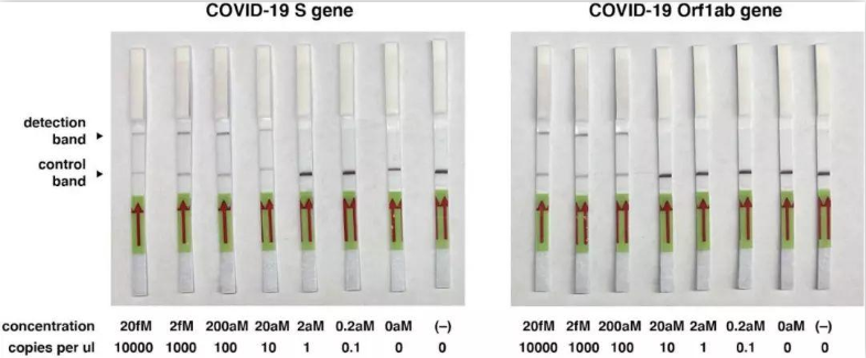 使用合成新冠病毒S基因和Orf1ab基因RNA片段的梯度稀釋液,能夠檢測到每微升10-100拷貝的合成新冠病毒RNA序列的。以下是針對不同輸入濃度的示例圖像: