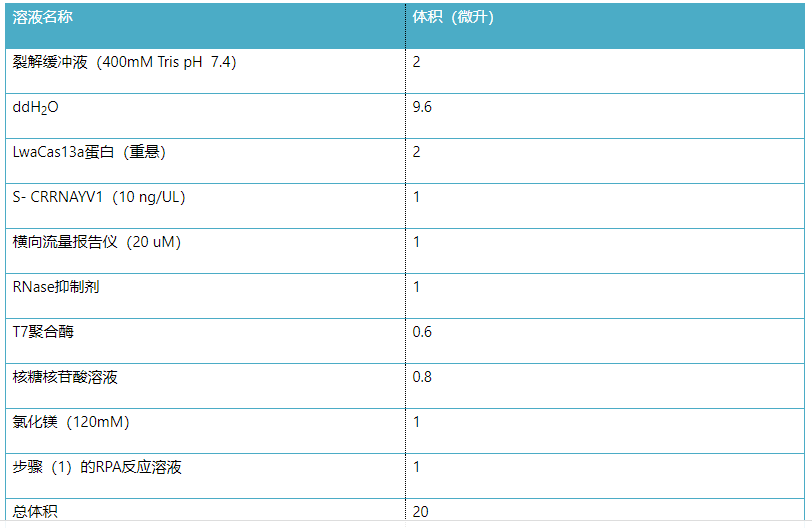 2、對于每個(gè)S基因RPA反應(yīng),按以下步驟建立Cas13檢測反應(yīng):