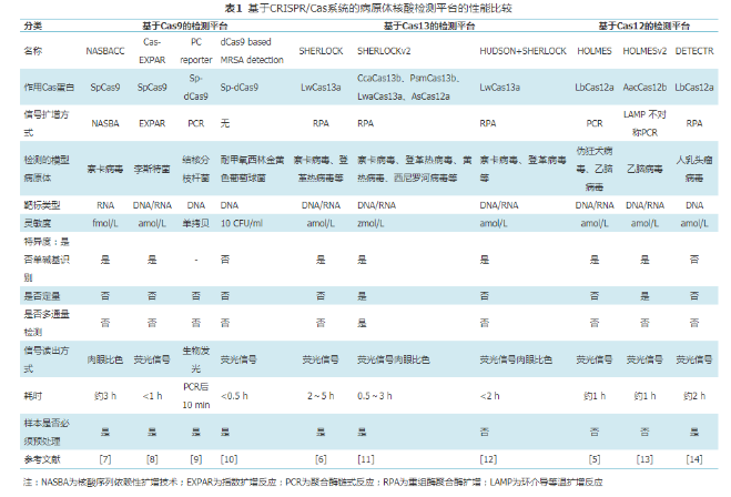 2019年,James課題組提出了一種對(duì)傳統(tǒng)材料進(jìn)行分子編程后用于生物傳感的策略。他們將Cas12a-gRNA復(fù)合物嵌入連有單鏈DNA的晶格結(jié)構(gòu)中制成水凝膠[15]。當(dāng)水凝膠系統(tǒng)暴露于靶標(biāo)DNA存在的環(huán)境中時(shí),Cas12a被激活,其對(duì)周?chē)鷨捂淒NA的反式切割使得水凝膠的骨架被剪切破壞,從而造成水凝膠的塌陷。在生物傳感方面,用此策略檢測(cè)了葡萄球菌的mecA基因片段,激活的Cas12剪切將淬滅熒光基團(tuán)連接于凝膠骨架的單鏈DNA,導(dǎo)致熒光信號(hào)產(chǎn)生。他們還將水凝膠嵌入微流控紙質(zhì)設(shè)備中,開(kāi)發(fā)了一種可以對(duì)埃博拉病毒進(jìn)行實(shí)施快速檢測(cè)的試紙條,這種試紙條在實(shí)戰(zhàn)中表現(xiàn)出相當(dāng)好的靈敏度和可重復(fù)性。新穎的組合方式使得老材料用了新用法,這種創(chuàng)新的思路可以催生更多新穎的生物傳感策略[16]。表1比較了上述具有代表性的基于CRISPR/Cas系統(tǒng)的病原體檢測(cè)分子診斷平臺(tái)的性能。