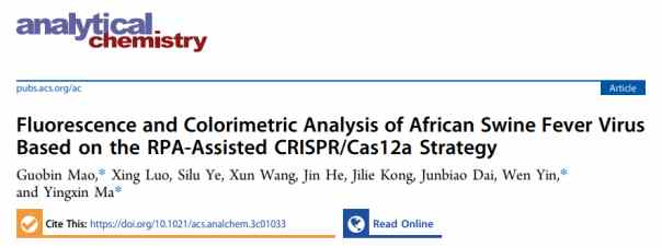2023年5月11日,中國(guó)科學(xué)院深圳先進(jìn)技術(shù)研究院合成生物學(xué)研究所馬英新課題組與湖北大學(xué)印文博士合作,在 Analytical Chemistry 期刊上發(fā)表了題為:Fluorescence and Colorimetric Analysis of African Swine Fever VirusBased on RPA-Assisted CRISPR/Cas12a Strategy 的補(bǔ)充封面論文。