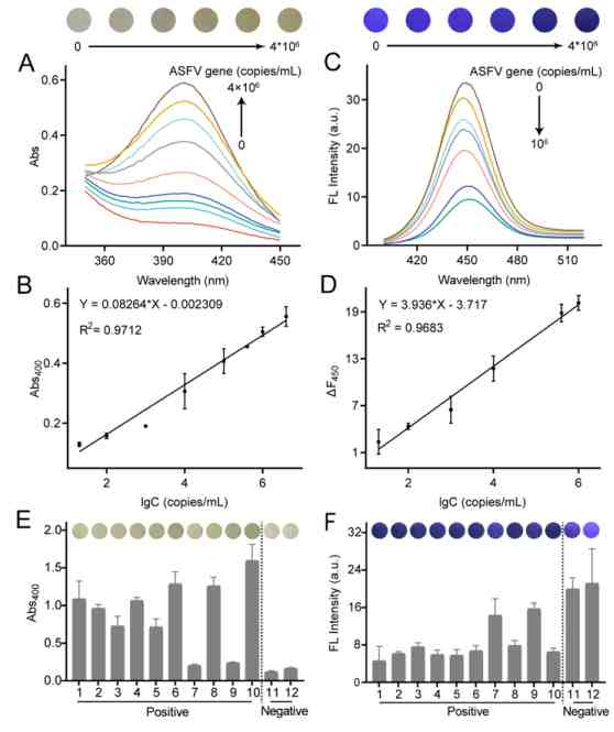 圖2 比色-熒光雙模式檢測(cè)ASFV基因。(A)不同濃度ASFV基因下,pNP的紫外光譜。(B)400 nm處吸光度與ASFV基因濃度的對(duì)數(shù)值之間的線性關(guān)系。(C)不同濃度ASFV基因下,CdZnSe QDs的熒光光譜。(D)熒光強(qiáng)度變化與ASFV基因濃度的對(duì)數(shù)值之間的線性關(guān)系。比色(E)和熒光(F)檢測(cè)方法用于臨床樣本的分析結(jié)果??梢暬瘷z測(cè)結(jié)果均列于圖片上方。