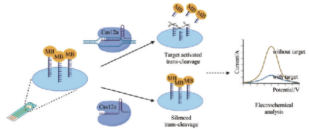 2019年,Dai等開發(fā)了基于CRISPR-Cas12a的E-CRISPR檢測技術,通過CRISPR-Cas系統(tǒng)來影響電信號輸出,利用Cas12a的反式切割活性獲得高傳導信號。該檢測技術將修飾有3′-亞甲基藍(3′-MB)標簽的ssDNA報告分子固定于金電極上,在靶DNA存在的情況下,Cas12a-crRNA反式切割MB-ssDNA分子,亞甲基藍標簽的分離,會使電化學信號降低。在沒有靶標DNA存在時,Cas12a的反式切割活性保持沉默,ssDNA分子保留在電極表面,從而導致亞甲基藍的高電化學電流。