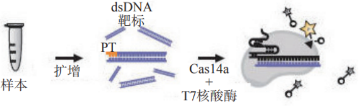 2018年王金、趙國屏團隊建立了HOLMES(one-hour lowcost multipurpose highly efficient system)檢測技術,聯(lián)合LbCas12a與PCR擴增,可以在1 h內完成對偽狂犬病毒(pseudorabies virus,PRV)和日本腦炎病毒(Japanese encephalitis virus,JEV)的檢測,靈敏度可以達到1~10 amol/L,此外還可以準確區(qū)分病毒基因型以及人類的單核苷酸多態(tài)性 。但是,該技術聯(lián)合PCR擴增提高穩(wěn)定性的同時也增加了檢測時間和設備依賴性。