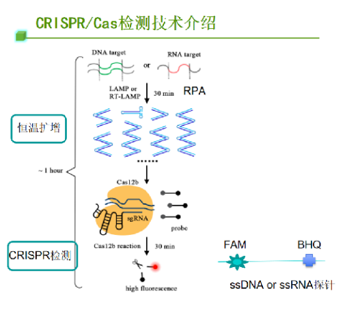 Cas13a:它在SgRNA引導(dǎo)下,可以識別并切割體系中的特異單鏈RNA。在切割特定RNA序列后,其“附屬切割”活性會被激活,可高效地切割體系中的任意序列sSRNA。