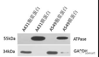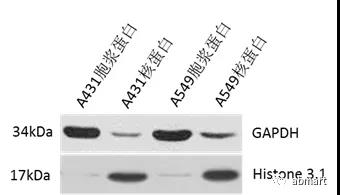 注:實驗中使用GAPDH(M20006)分析細(xì)胞漿蛋白提取物,使用ATPase(T40109)分析細(xì)胞膜蛋白提取物,使用Histone(P30266)分析細(xì)胞核蛋白提取物。