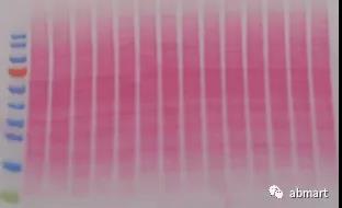 為檢測轉(zhuǎn)膜是否成功,用TBST 洗膜,然后用麗春紅染色,室溫下震蕩5分鐘。然后將膜浸泡在水中直至水變清且出現(xiàn)蛋白條帶。觀察膜上的條帶是否清晰,各分子量條帶均可見,無明顯白色空斑(氣泡導(dǎo)致)。