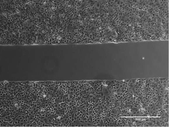 在顯微鏡下選取能同時(shí)看到“劃痕”和兩邊細(xì)胞的視野進(jìn)行成像,“劃痕”的方向最好是水平或者垂直。