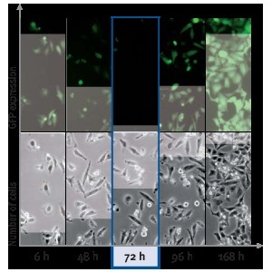 轉(zhuǎn)基因HeLa-GFP細(xì)胞GFP表達(dá)序列的研究? SI+和siRNA直接作用于GFP的mRNA。清晰可見的是GFP表達(dá)在72小時(shí)內(nèi)下降到最大值。