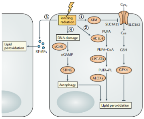 放療可通過(guò)多種機(jī)制引起癌細(xì)胞的鐵死亡。抑制SLC7A11激活A(yù)CSL4的表達(dá),從而促進(jìn)PUFAs插入到膜磷脂中,形成含多不飽和脂肪酸的磷脂(PUFA-PLs),用于隨后的脂氧合酶介導(dǎo)的氧化。受輻射的腫瘤細(xì)胞釋放的微粒(RT-MPs)主要通過(guò)鐵死亡來(lái)產(chǎn)生,這種微??烧T導(dǎo)旁效應(yīng)。環(huán)狀GMP-AMP合成酶(cGAS)的激活信號(hào)誘導(dǎo)自噬依賴的鐵死亡。