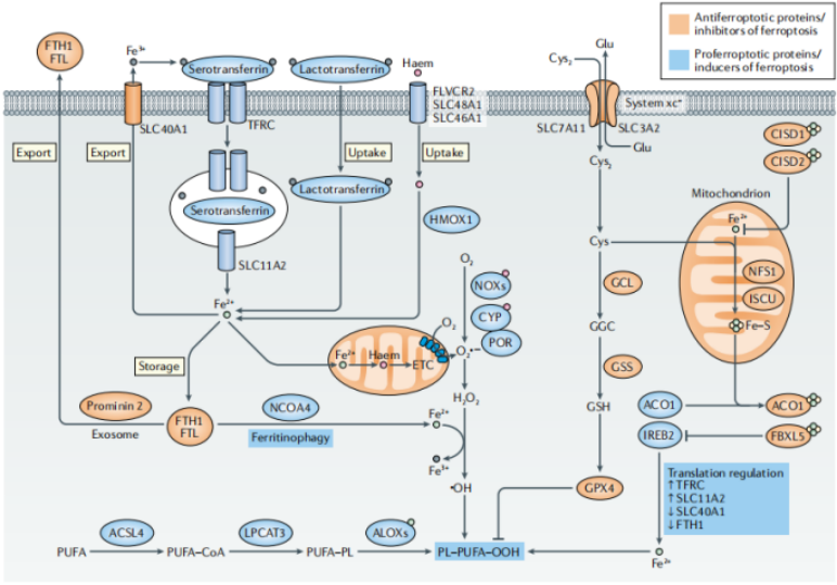 載鐵的血清轉(zhuǎn)鐵蛋白-轉(zhuǎn)鐵蛋白受體(TFRC)復(fù)合物通過(guò)核內(nèi)體內(nèi)化,通過(guò)自然抗性相關(guān)巨噬細(xì)胞蛋白(SLC11A2)釋放鐵(Fe2+)到細(xì)胞質(zhì)中。乳轉(zhuǎn)鐵蛋白和血紅素通過(guò)細(xì)胞膜中不同的攝取途徑提供額外的鐵來(lái)源。Fe2+主要通過(guò)細(xì)胞膜上的溶質(zhì)載體家族(SLC40A1)輸出,但也可以通過(guò)外泌體作為鐵蛋白輸出。鐵死亡在翻譯水平上受鐵調(diào)節(jié)蛋白(IRPs) ACO1和IREB2的調(diào)控。