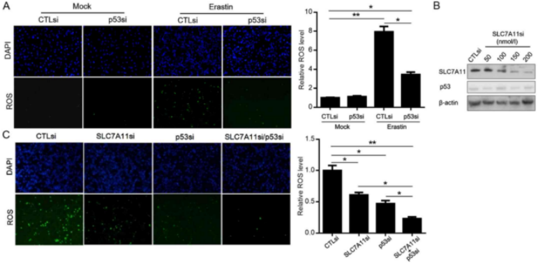 p53的表達(dá)增加了erastin誘導(dǎo)的ROS生成,部分依賴于SCL7A11表達(dá)降低: