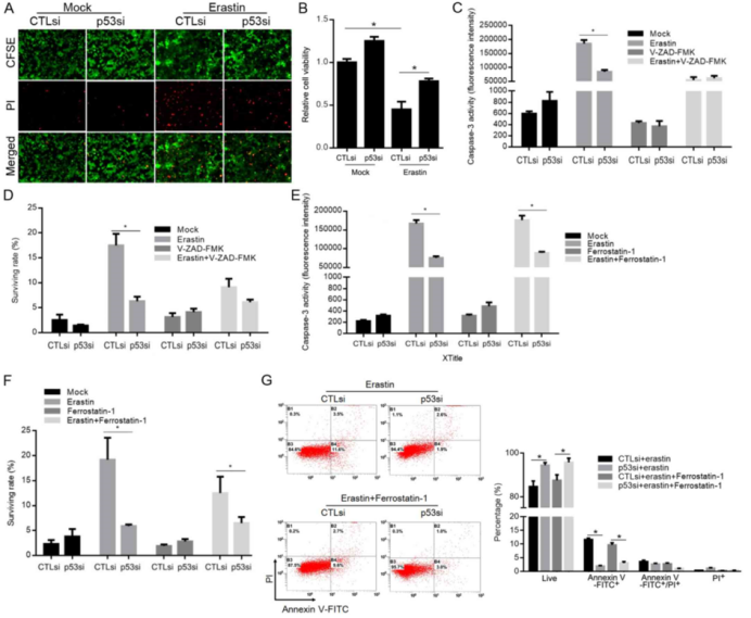 通過(guò)檢測(cè)caspase-3活性而確認(rèn)的凋亡(圖4C),p53的敲低抑制了erastin誘導(dǎo)的細(xì)胞死亡,如CFSE / PI雙重染色(圖4D)。