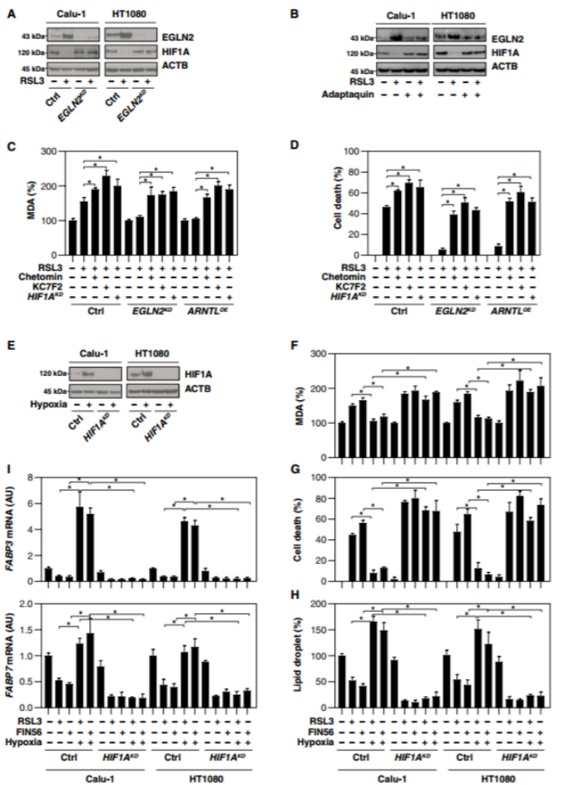 7F~I:分析MDA水平(F),細(xì)胞死亡(G),脂滴(H)和基因mRNA (I)表示的在缺氧(1% O2, 24小時(shí))預(yù)處理后進(jìn)行在RSL3(0.5μM), FIN56(5μM) 12小時(shí)(n = 3 * P < 0.05)條件下HT1080和Calu-1細(xì)胞培養(yǎng)。