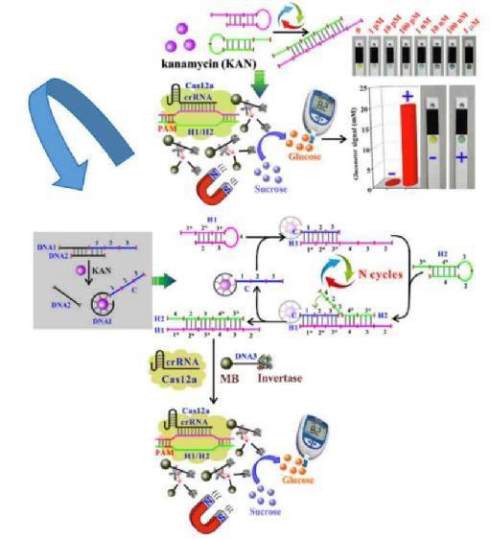 卡那霉素(Kan)是一種含有順二醇的氨基糖苷類抗生素,通常用于畜牧業(yè)和水產(chǎn)養(yǎng)殖業(yè)預(yù)防細(xì)菌感染??敲顾卮蠖嘤蓜?dòng)物的腎臟代謝為糖苷并通過(guò)尿液排出,但Kan的濫用導(dǎo)致動(dòng)物源性食品和水樣中存在抗生素殘留,最終可能在人體內(nèi)產(chǎn)生累積,可能會(huì)導(dǎo)致多種嚴(yán)重的副作用(如腎毒性、神經(jīng)毒性、耳毒性和過(guò)敏反應(yīng)),甚至產(chǎn)生抗生素耐藥性。近年來(lái),各種分析技術(shù)已被應(yīng)用于抗生素殘留的靈敏檢測(cè),包括電泳、酶聯(lián)免疫吸附法、熒光法和高效液相色譜法,但是大多數(shù)技術(shù)仍存在操作繁瑣、成本高、操作時(shí)間長(zhǎng)等局限性。因此,需要一種簡(jiǎn)單、快速、超靈敏的抗生素檢測(cè)策略。今年3月,廣東省科學(xué)院生態(tài)環(huán)境與土壤研究所陳俊華等研究人員開(kāi)發(fā)了一種基于血糖儀和CRISPR-Cas12a的卡那霉素(Kan)檢測(cè)方案,該方案具有操作簡(jiǎn)單、成本低、便于大眾使用等優(yōu)點(diǎn),可以實(shí)現(xiàn)現(xiàn)場(chǎng)檢測(cè),堅(jiān)固耐用,可以在資源有限的環(huán)境下實(shí)現(xiàn)抗生素殘留的現(xiàn)場(chǎng)檢測(cè)。其線性范圍為1 pM ~ 100 nM,檢出限為1 pM。
