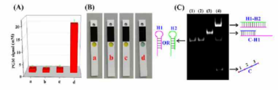 作者在不同的條件下,研究了該方案的可行性。如圖2A所示,沒(méi)有目標(biāo)Kan,C鏈在DNA1-DNA2雙鏈中被阻斷,H1和H2的組裝無(wú)法發(fā)生(直方圖a)。如果傳感系統(tǒng)中不存在H1(直方圖b),與直方圖a相比,血糖讀數(shù)沒(méi)有明顯變化。在缺少Cas12a的情況下(直方圖c), Cas12a介導(dǎo)的裂解功能無(wú)法發(fā)揮作用,血糖儀信號(hào)可以忽略不計(jì)。正如預(yù)期的那樣,只有當(dāng)檢測(cè)系統(tǒng)中所有組分都完整時(shí),才能產(chǎn)生血糖儀讀數(shù)(直方圖d)。