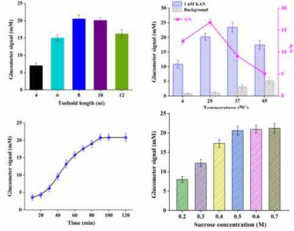 為了獲得更好的用于Kan檢測(cè)的血糖儀傳感器的分析結(jié)果,對(duì)C鏈的支點(diǎn)(結(jié)構(gòu)域1)長(zhǎng)度、體系的反應(yīng)溫度、與Cas12a的反應(yīng)時(shí)間以及蔗糖濃度等實(shí)驗(yàn)參數(shù)進(jìn)行了優(yōu)化(圖3)。首先對(duì)C鏈的支點(diǎn)長(zhǎng)度進(jìn)行優(yōu)化,選擇最佳長(zhǎng)度8 nt,過(guò)短的話會(huì)影響鏈置換。考慮到最佳的信噪比(S/N),選擇25℃作為最佳反應(yīng)溫度。90 min內(nèi)血糖儀信號(hào)隨著反應(yīng)時(shí)間的增加而增加,90 min后響應(yīng)信號(hào)停止增加,因此,Cas12a的最佳反應(yīng)時(shí)間為90 min。進(jìn)一步優(yōu)化了蔗糖濃度,0.2-0.5 M信號(hào)值增加,0.5 M以后基本達(dá)到平臺(tái)期,因此最佳濃度為0.5 M (圖3)。