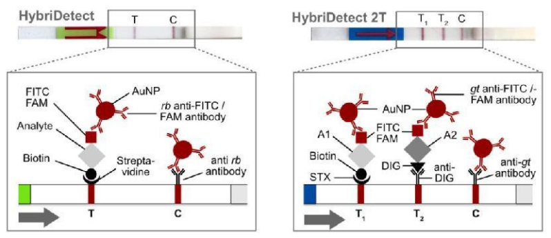 HybriDetect通常用于DNA擴增產(chǎn)物的快速檢測。許多客戶會使用帶有Biotin、FITC/FAM修飾的引物,反應(yīng)產(chǎn)物包含這些標簽,從而可以在HybriDetect試紙條上被檢測到。如PCR和多種等溫擴增技術(shù)(如LAMP-LFA)均可以和HybriDetect一起應(yīng)用。此外,由于標記探針的特異性雜交,這種方法允許大量核酸(如核糖體RNA)的直接檢測(無需擴增)。