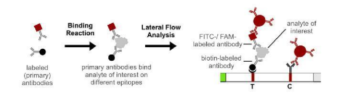 圖4. 非競爭性(免疫)分析,標記抗體能夠特異性結(jié)合靶標分子,這種“三明治”結(jié)構(gòu)可以HybriDetect試紙條上檢測到。