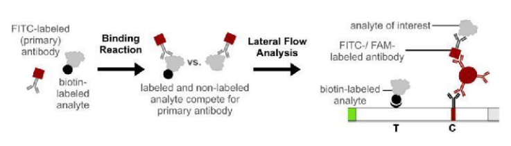 圖5.競爭(免疫)分析法的原理。標記的靶標與未標記的靶標(在樣品中)競爭結(jié)合標記抗體。T線強度的降低與靶標分子的增加相關(guān)。