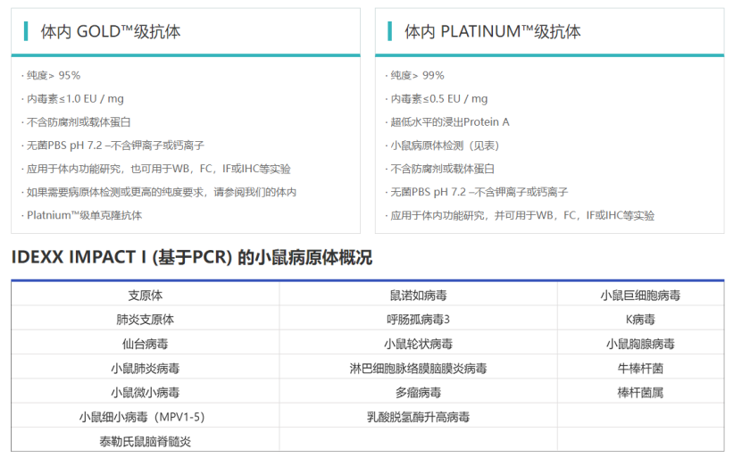 Leinco Technologies通過(guò)其特有的制備工藝,生產(chǎn)具有業(yè)內(nèi)最高純度標(biāo)準(zhǔn)的體內(nèi)功能級(jí)抗體。其In vivo PLATINUM™級(jí)功能抗體對(duì)于純度、內(nèi)毒素、聚集體和浸出Protein A水平都有最為嚴(yán)格的質(zhì)控標(biāo)準(zhǔn);此外,In vivo PLATINUM™級(jí)抗體均不含病原體,通過(guò)了IDEXX Impact I PCR小鼠病原體譜檢測(cè)。以其嚴(yán)格的質(zhì)控標(biāo)準(zhǔn)、優(yōu)異的產(chǎn)品性能,Leinco的抗體類(lèi)產(chǎn)品得到了科研領(lǐng)域及工業(yè)領(lǐng)域的廣泛認(rèn)可,已有大量引用文獻(xiàn)可以參考。