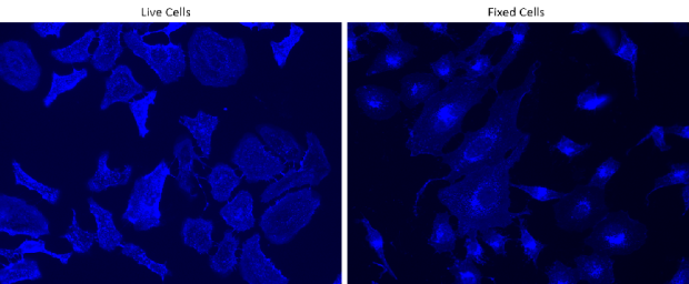圖3. 用 10 µg/mL 的 iFluor350小麥胚芽凝集素 (WGA)探針 對(duì)活的和固定的 HeLa 細(xì)胞進(jìn)行染色 30 分鐘。使用 DAPI 濾光片組在熒光顯微鏡上獲取圖像。