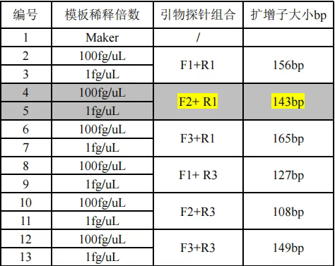 • 確定最優(yōu)引物組合F2+ R1后,進(jìn)行初步靈敏度確認(rèn);