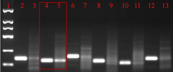 • 模板選擇高、中、低濃度測(cè)試,選擇條帶明顯、低濃度有擴(kuò)增的引物組合;