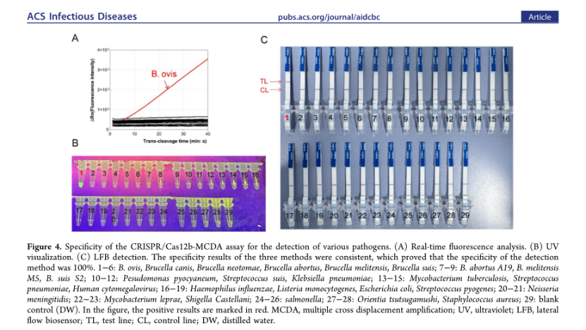 近期,貴州省疾病預(yù)防控制中心在《ACS Publications》發(fā)表重磅研究成果。研究團隊開發(fā)了一種結(jié)合多重交叉置換擴增(MCDA)與CRISPR/Cas12b系統(tǒng)的新型檢測方法,用于快速、靈敏、特異地檢測綿羊布魯氏菌(Brucella ovis),為動物疫病防控及公共衛(wèi)生安全提供了重要技術(shù)支撐。