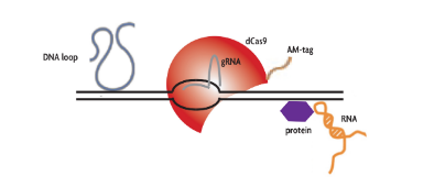 含有20個核苷酸與所需基因組區(qū)域互補的指導RNA (gRNA)與標記的酶活性不活躍的Cas9蛋白(dCas9)結(jié)合表達。gRNA將dCas9蛋白定向到目標序列,形成RNA-DNA異雙工。然后使用針對am標記的dCas9蛋白的抗體在細胞上進行染色質(zhì)免疫沉淀,以富集由gRNA/dCas9復合物結(jié)合的基因組序列。