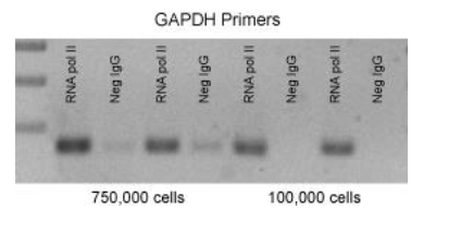 用1%的甲醛固定Hela細(xì)胞10分鐘,使用超聲法破碎染色質(zhì),使用陰性對(duì)照IgG和RNA pol II抗體,對(duì)不同細(xì)胞數(shù)量來(lái)源(100,000到750,000個(gè)細(xì)胞)的染色質(zhì)進(jìn)行ChIP,重復(fù)2次。使用陽(yáng)性對(duì)照引物GAPDH對(duì)ChIP后的DNA進(jìn)行36個(gè)循環(huán)的PCR分析(抗體和引物包含在人ChIP-IT對(duì)照試劑盒里,Active motif也可以提供小鼠和大鼠對(duì)照試劑盒)。取10ul PCR產(chǎn)物進(jìn)行1%凝膠電泳,EB染色后紫外觀察。結(jié)果顯示與使用陰性對(duì)照IgG相比,使用RNA pol II抗體的ChIP大量富集了GAPDH啟動(dòng)子區(qū)域的DNA序列。
