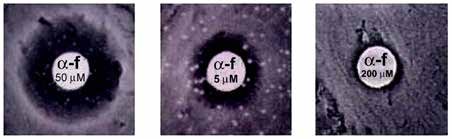 α-因子活性測定。α因子肽信息素(10 μl)作用于MATa細胞草坪上的無菌過濾器,分別為野生型BAR1 (200 μM,右)pro挑逗或BAR1 Δ (50 μM,左;5μM,中心)。敏感的α-因子明顯表現(xiàn)為清理區(qū)(G1逮捕了細胞)。BAR1蛋白酶缺失的細胞對α-因子的活性比bar -1蛋白酶陽性的野生株高需要多20 - 50倍的信息素來阻止細胞。 |